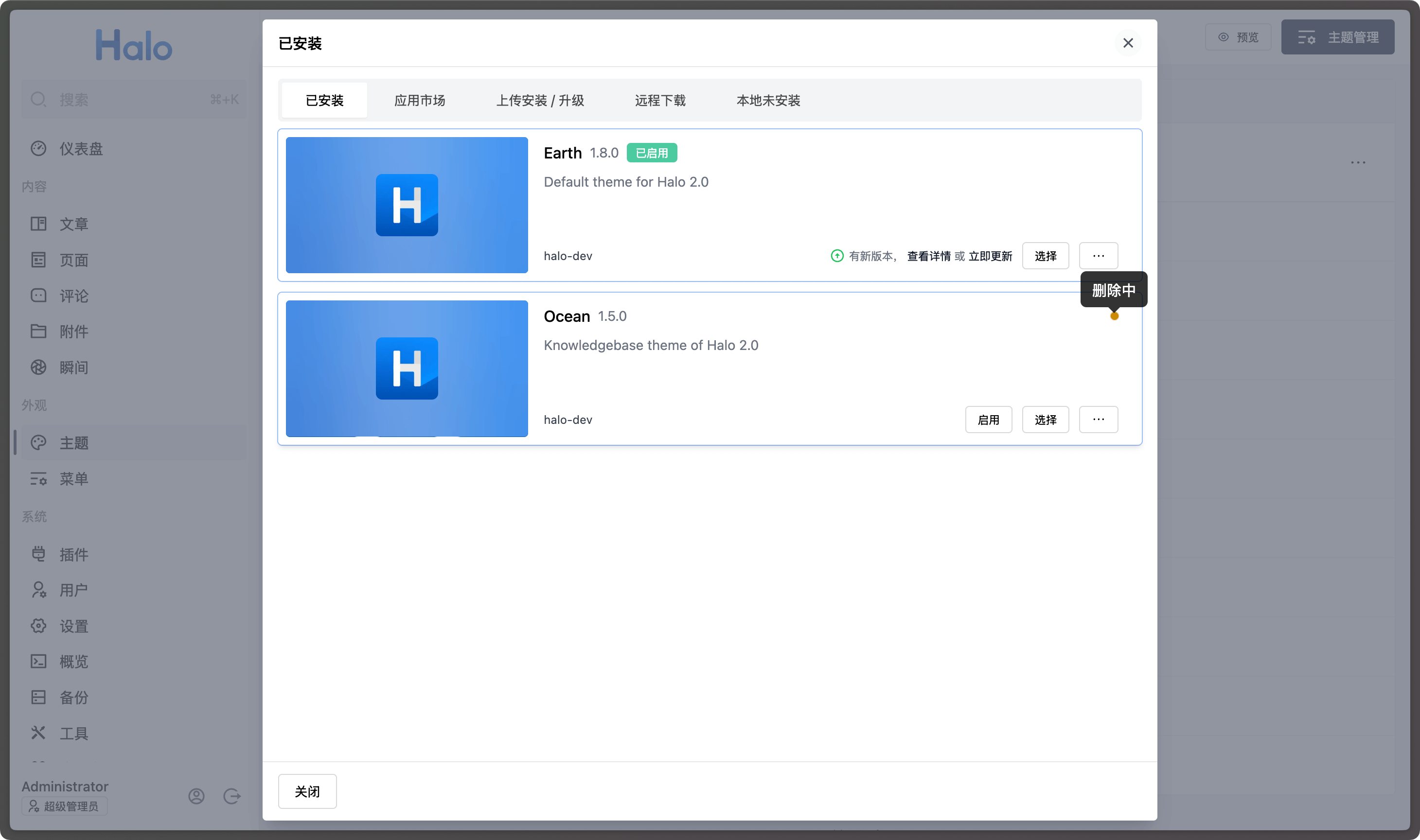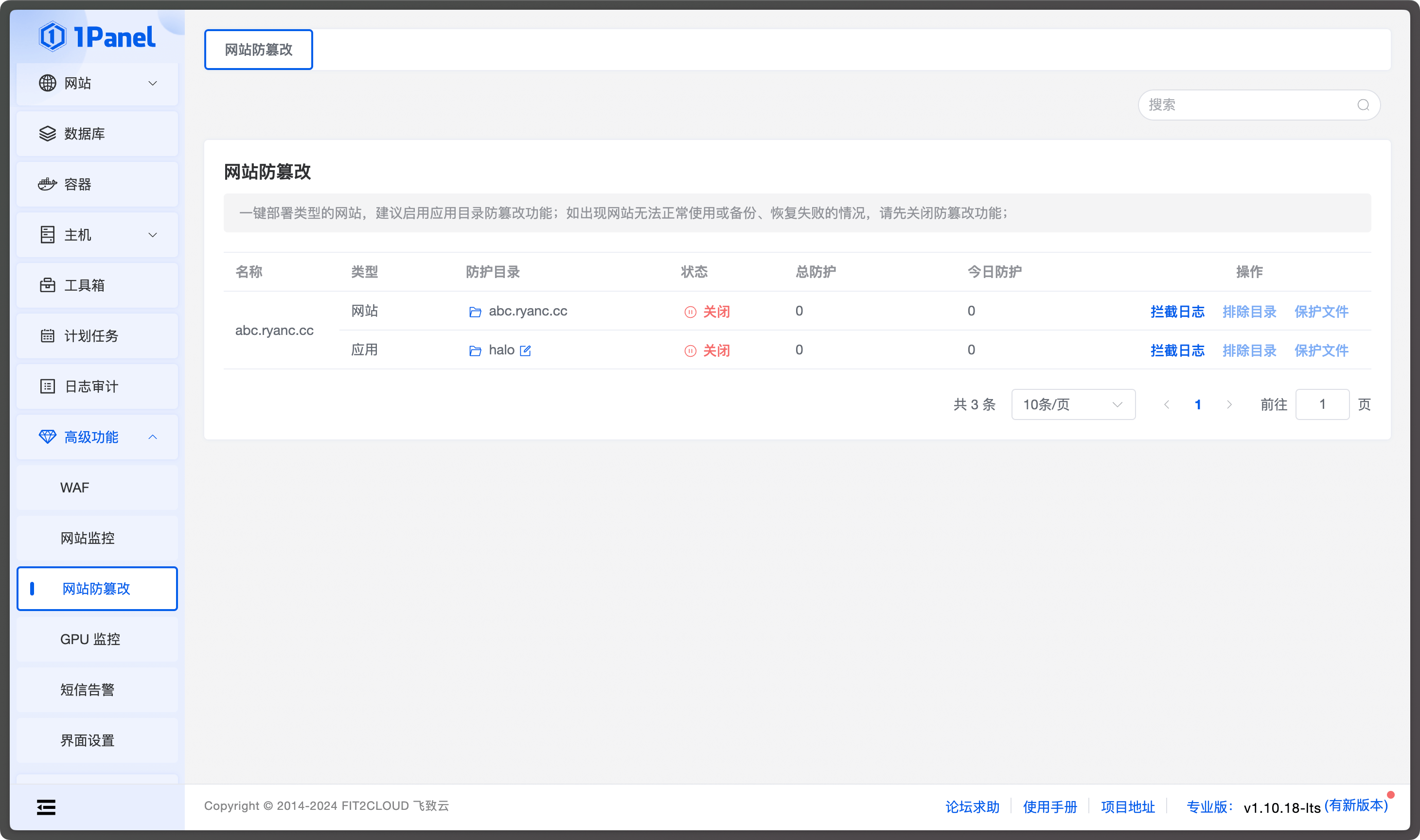1Panel 的网站防篡改功能是为了保护网站目录,不允许任何外部程序对受保护的目录进行修改,因为 Halo 在整个运行过程中,可能涉及到附件上传/删除,主题安装/卸载、备份恢复等功能,这些功能都会去操作应用目录,所以不要为 Halo 的应用目录开启网站防篡改功能。