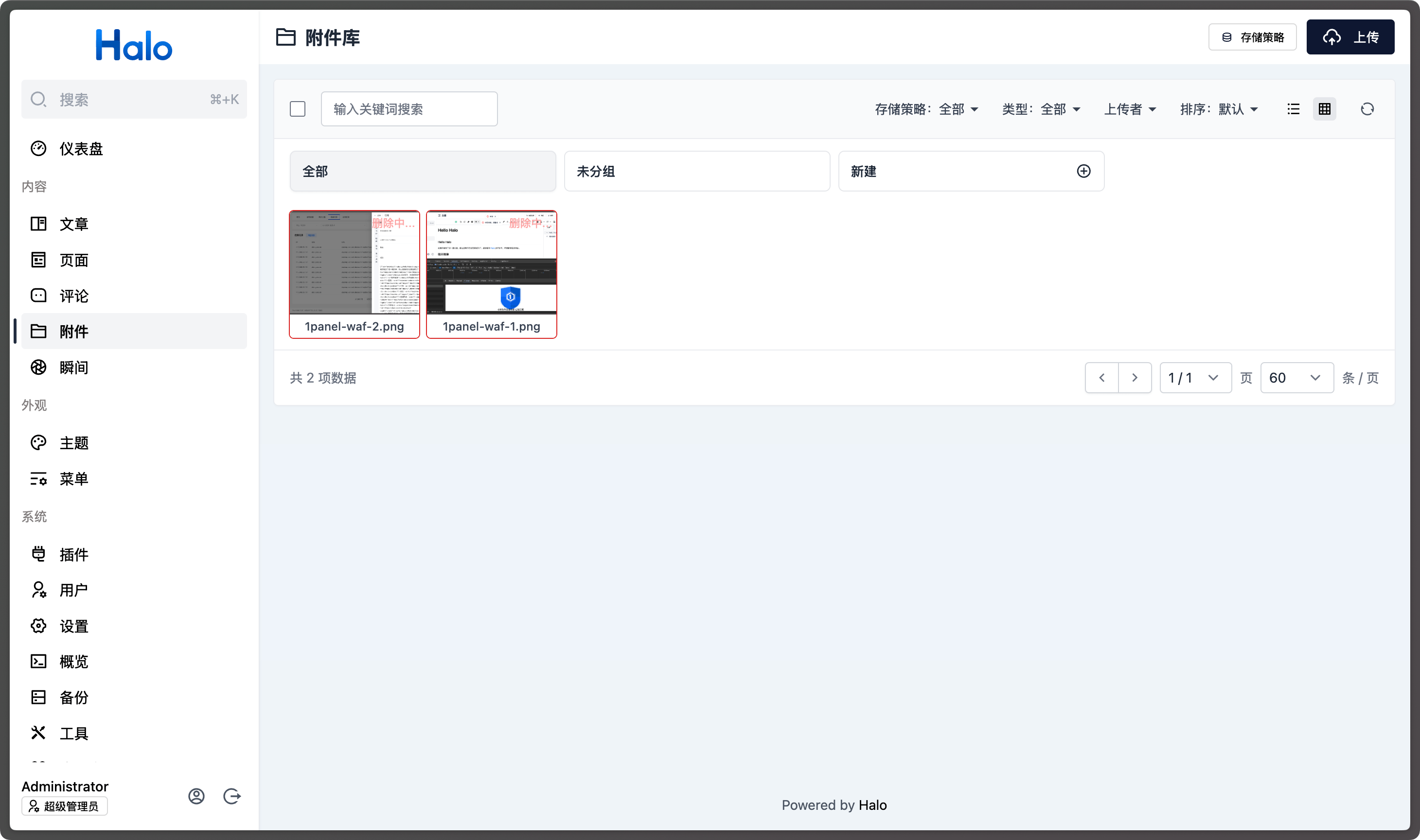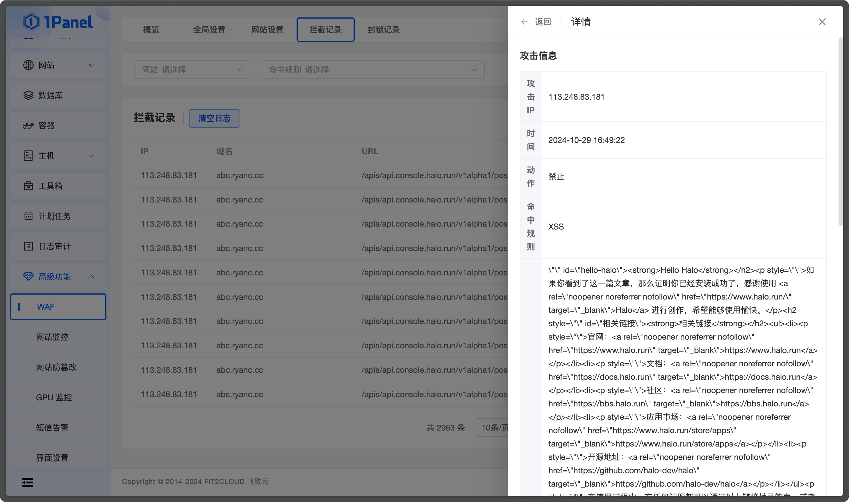 WAF 即 Web 应用防火墙,可以保护你的网站免受恶意攻击,如 SQL 注入、XSS 攻击等,但在 Halo 控制台有不少接口需要传输 HTML 内容,这很容易导致误判,如果你遇到下面这些问题,代表被 1Panel 的 WAF 功能拦截,导致流量并没有经过 Halo,建议在 1Panel 的 WAF 功能的拦截记录中查看问题详情,并自行决定处理措施。