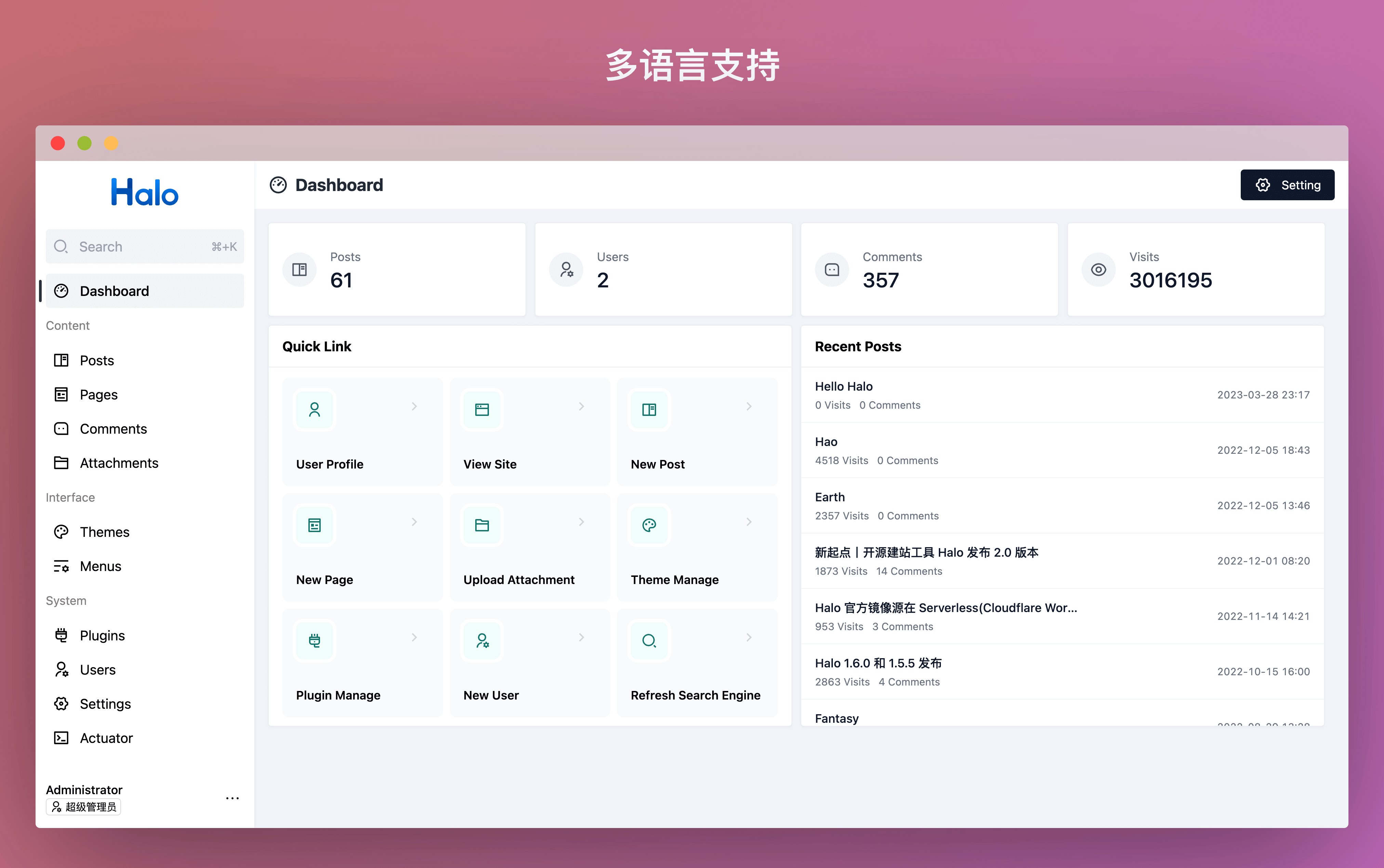 从 Halo 2.4.0 开始,Halo 将逐步支持国际化,目前我们已经为管理端添加了简体中文和英文的语言包。同时我们非常期欢迎大家帮助完善其他语言包。